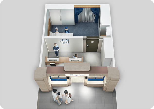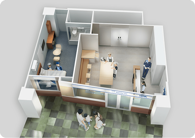 東横インは、「ホテル」パビリオンでの体験を通して、こども達が、さまざまなおもてなしの心、おもてなしが多くのスタッフの連携により成り立っていることに気づくとともに、「ホテル」は人々を笑顔にし、感動を与えられる場であると実感してくれることを願っています。